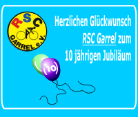 10 Jahre besteht der RSC Garrel nun. In der großen Turnhalle, in Garrel, wurde ab 16:00 gefeiert. Nachdem der 1. Vorsitzende Reinhard Meyer die Jubiläumsrede vor großem Publikum hielt, wurden viele radsportliche Aktivitäten aufs Parkett gelegt. Als besonders akrobatisch zeigte sich eine Radsportgruppe aus Bremen.