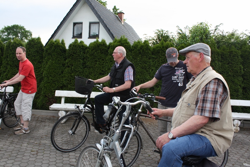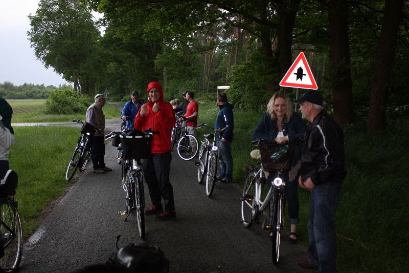 Ganz trocken war die Fahrt nicht, denn verhangene Wolken begleiteten die Radwanderer. Hin und wieder war ein kleines Schauer niedergegangen. Doch das kann einen echten Natur-Radler u. Radlerin nicht die gute Laune vermiesen. Und die netten Bäume am Wegesrand hielten uns weitesgehend trocken. Taktgeber Anton Rolf-Wittlake versuchte nicht schneller als 15 km/h zu fahren. Alle hielten Anschluss.
