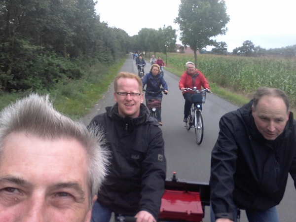 Der RSC Vorstandsvorsitzende Anton Rolf-Wittlake begrüßte alle Teilnehmer um 11:15 Uhr beim Vereinsheim Thüle zur Abfahrt. Acht Personen fuhren auf dem Vereinseigenen Achter Tandem des RSC Thüle voran. Ziel waren die Ahlhorner Fischteiche an der nahen A28.
