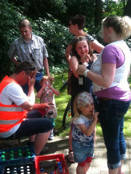 Pünktlich um 15.00 Uhr ist die Gruppe von ca. 30 kleinen und großen Radlern Richtung Bösel „Fladderborg“ gestartet. Auf der ca. 7 km langen Hinfahrt haben wir eine kleine Pause gemacht. Hier gab es für die kurzen Beine Erfrischungsgetränke.