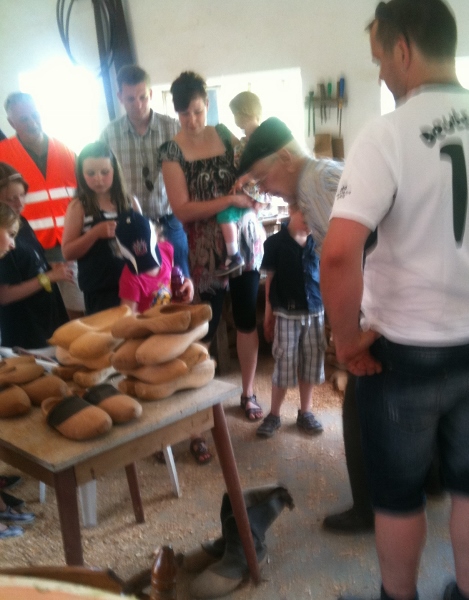 Schnell hatten einige Kinder die Schuhe ausgezogen um einen Holzschuh zu testen. Auch kam bei einigen der Wunsch auf, ein Paar Holzschuhe zu erwerben. Nach der Vorführung konnten wir auf dem Hof einen Platz zum Grillen nutzen. Dafür nochmals einen herzlichen Dank an die Familie Nording. Da diese Fahrt mit dem Kinderlogo „RADI“ angekündigt war, gab es für die Kinder „Gegrilltes und Getränke“ gratis.
