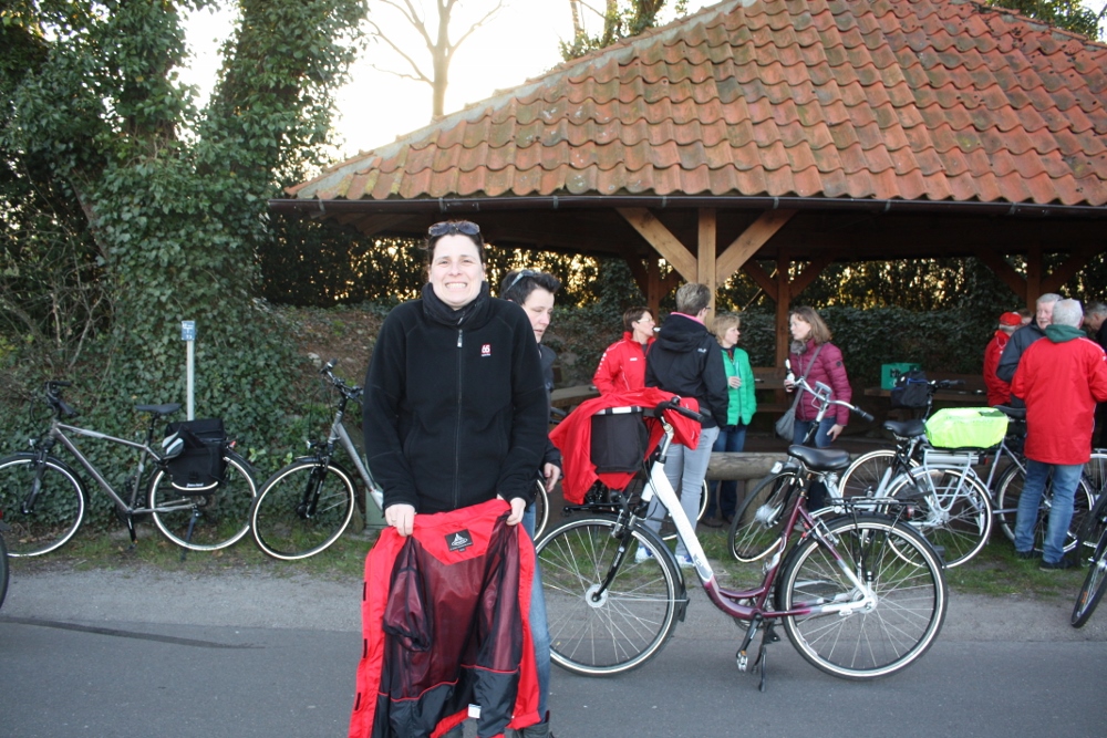 Während der Pause in Falkenberg fiel einigen Radlern die neue Vereinsregenjacke auf, die auf der Jahresmitgliederversammlung vorgestellt wurde. Die Pause wurde eine längere, da 10 Personen ihre Bestellung und Größen in die Order-Liste eintrugen.
