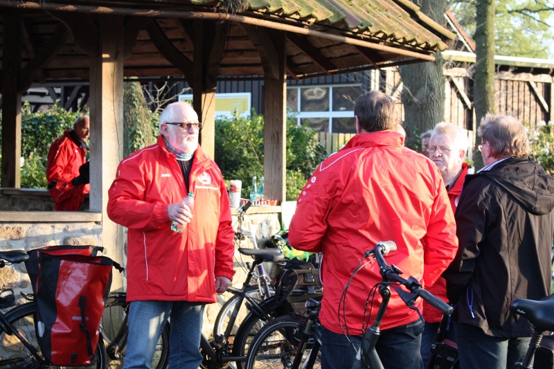 Theo Schweres ( rechts neben Michael Pennicke am stärksten Baum ) aus Harkebrügge ist ein festes Mitglied der Thüler Fahrradgruppe geworden. Er reist radelnd mit dem Rad an und fährt die Runde mit. In diesem Fall waren es 27,5 km und er fährt selbstverständlich zu seinen Heimatort Harkebrügge auch mit dem Rad zurück. So, sagt er "Schaffe ich bis zu 7000 km im Jahr". Eine wahrhaft stramme Leistung ohne elektronische Unterstützung. Davon will er noch nichts wissen, hat ihn sein Arzt verboten, so Theo schmunzelnd. Oben auf dem Titelbild kann man Theo mit Wasserflasche näher betrachten, wenn man es heranzoomt.