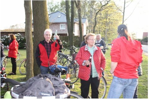 Theo Schweres ( rechts neben Michael Pennicke am stärksten Baum ) aus Harkebrügge ist ein festes Mitglied der Thüler Fahrradgruppe geworden. Er reist radelnd mit dem Rad an und fährt die Runde mit. In diesem Fall waren es 27,5 km und er fährt selbstverständlich zu seinen Heimatort Harkebrügge auch mit dem Rad zurück. So, sagt er "Schaffe ich bis zu 7000 km im Jahr". Eine wahrhaft stramme Leistung ohne elektronische Unterstützung. Davon will er noch nichts wissen, hat ihn sein Arzt verboten, so Theo schmunzelnd. Oben auf dem Titelbild kann man Theo mit Wasserflasche näher betrachten, wenn man es heranzoomt.