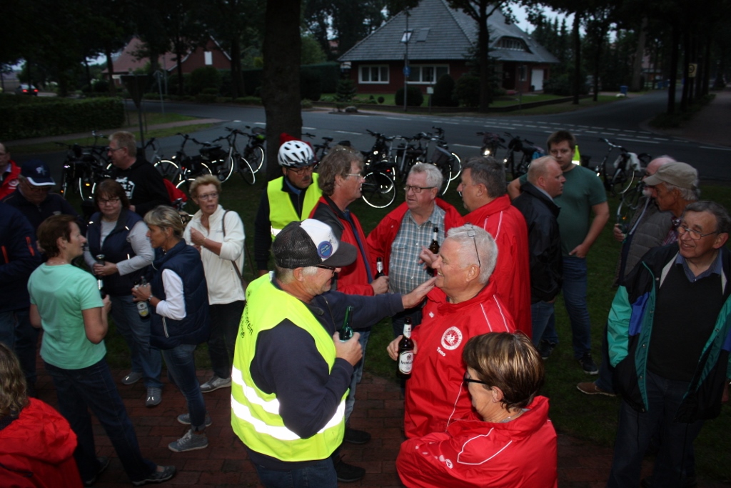 Aufgrund der Dötlingen Fahrt am 24. Juni 18 trafen sich beide Vereine erstmals in Hengstlage auf dem Heidesportplatz während einer Pause. Und so vereinbarte man sich zu einem Treffen zum Saisonabschluss beider Vereine in Nikolausdorf zu einem kleinen Plausch um 19:30 Uhr am 6. Sept. 18. Die Thüler waren zwar die Schnelleren aber mit 25 Sätteln konnte Hengstlage einen Radfahrer mehr aufweisen. Das allerdings war nur ein kleiner Stärkespass am Rande. Alle verstanden sich auf Anhieb prächtig, denn beide Vereine begrüßten sich bei Ankunft lautstark mit ihrer Vereinsgeste. Thüles Vorsitzender Antonius Rolf-Wittlake begrüßte Radlerlust Hengstlage aufs Herzlichste und hofft durchaus weitere Begegnungen in den nächsten Jahren ohne Druck anzustreben. "Wir haben Getränke dabei, laßt uns anstoßen und Danke, das ihr gekommen seid," so der Vorsitzende. Holger Arndt, dem Radlerlust Hengstlage vorstehend, bedankte sich ebenfalls für die tolle Zusammenkunft in Nikolausdorf und lud die Thüler im nächsten Jahr zum 40 jährigen Bestehen nach Hengstlage ein. Der Saisonplan ist zwar immer eng geschnürt wie bei euch auch aber hier und da sollte ein wenig Luft sein um dieses Trefffen zu wiederholen. Gegen 20:15 Uhr trennten sich dann ihre Wege und beide Vereine zog es nach Hause zum eigenen Saisonabschluss. Jan Thiele, schon in Nikolausdorf als Getränkeanlieferant anwesend, bereitete die 180 gr. Bratwürste bei Ankunft seiner Thüler Radler hinterm Vereinsheim hervorragend vor. Auch hier fand Antonius Rolf-Wittlake lobende Worte für die vergangene Saison. Er bestärkte die TFT Freunde die Generalversammlung am Samstag, dem 25. Januar 2019, zu besuchen. Dort würde sich jeder noch tiefere Eindrücke des RSC Thüle holen. Am kommenden Sonntag ( 9.Sept. ) ist für die angemeldeten Teilnehmer der 2. Tagestour nach Bourtange, in den Niederlanden, der Start pünktlich um 08:00 Uhr ab Vereinsheim Thüle. Das Team um Fahrtenleiter Olaf Brünen hat alles dafür getan um einen reibungslosen Ablauf zu gewährleisten.