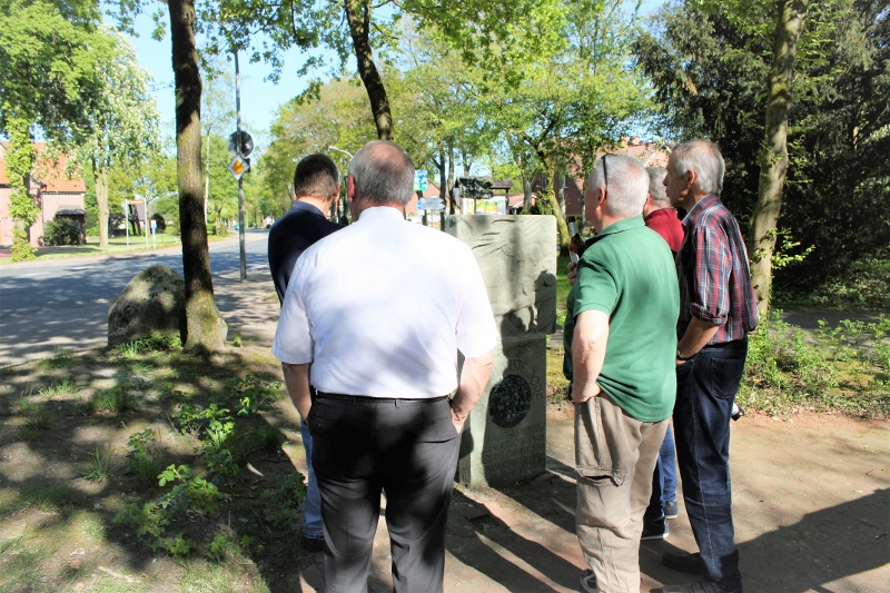Vor einigen Jahren wurde der obere Teil der Stele auf dem Dorfplatz wahrscheinlich mutwillig abgeknickt. Die Montageeisen waren verbogen und zwei Ecken vom Stein abgebrochen. Auf Initiative von Antonius Rolf-Wittlake hat der RSC Thüle jetzt die Instandsetzung übernommen. Fachmännisch unterstützt wurde der RSC bei der Reparatur und dem zementieren des Gedenksteins von Lars Berling. Jens Moorbrink, Hubert Schumacher und Willi Müller brachten den Stein mit einem Radlader in Position und die Vorstandsmitglieder des RSC richteten den Stein dann aus. Die Wartezeit zum Aushärten des Beton verkürzte Bernd Sieger, Kassenwart des Orts- und Heimatvereins, indem er eine Kiste Bier zur Verfügung stellte. Auch der Vorsitzende des Orts- und Heimatvereins Josef Moorbrink war vor Ort und zeigte sich erfreut darüber das der Stein wieder vollständig ist.