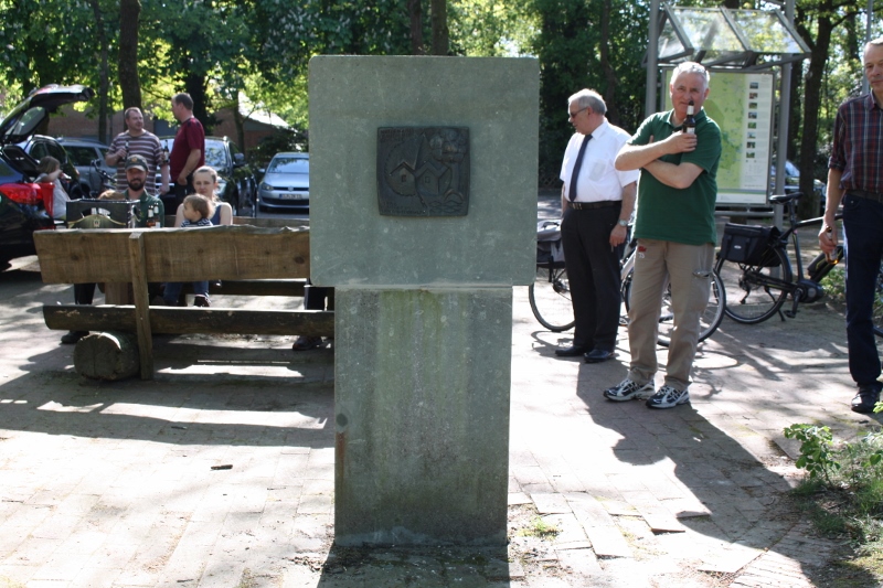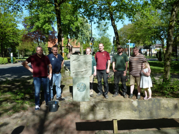 Vor einigen Jahren wurde der obere Teil der Stele auf dem Dorfplatz wahrscheinlich mutwillig abgeknickt. Die Montageeisen waren verbogen und zwei Ecken vom Stein abgebrochen. Auf Initiative von Antonius Rolf-Wittlake hat der RSC Thüle jetzt die Instandsetzung übernommen. Fachmännisch unterstützt wurde der RSC bei der Reparatur und dem zementieren des Gedenksteins von Lars Berling. Jens Moorbrink, Hubert Schumacher und Willi Müller brachten den Stein mit einem Radlader in Position und die Vorstandsmitglieder des RSC richteten den Stein dann aus. Die Wartezeit zum Aushärten des Beton verkürzte Bernd Sieger, Kassenwart des Orts- und Heimatvereins, indem er eine Kiste Bier zur Verfügung stellte. Auch der Vorsitzende des Orts- und Heimatvereins Josef Moorbrink war vor Ort und zeigte sich erfreut darüber das der Stein wieder vollständig ist.