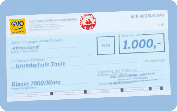 THÜLE Seit 2007 beteiligt sich die Grundschule Thüle zur Gesundheitsförderung, Gewalt- und Suchtvorbeugung am Unterrichtsprogramm „Klasse 2000“. Die Schule konnte sich jetzt über eine Spende in Höhe von 1000 Euro vom Radsportclub (RSC) Thüle mit Unterstützung der GVO Versicherung freuen. Den Betrag überreichten Florian Krahn und Oliver Kleinhans von GVO.